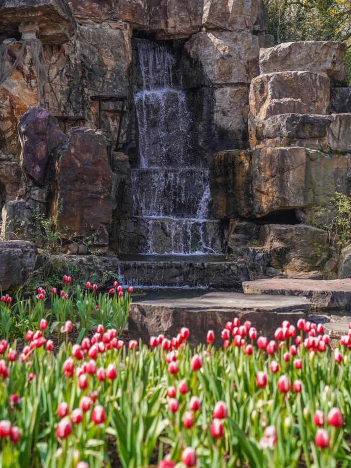 从上海植物园1号门进入,走到黄山石瀑布,草坪上有一排单色郁金香,红得似火,燃烧着春日的热情。