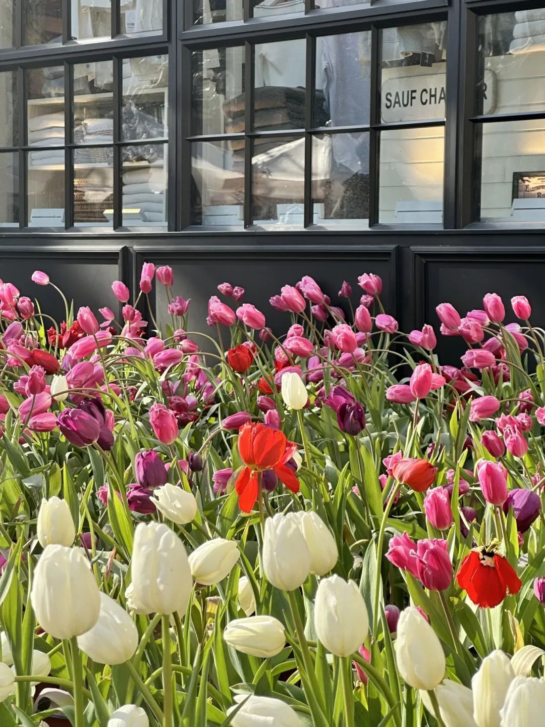 店门口的郁金香悄然绽放,五彩斑斓的花海是春日限定的浪漫。