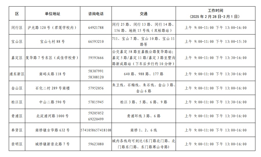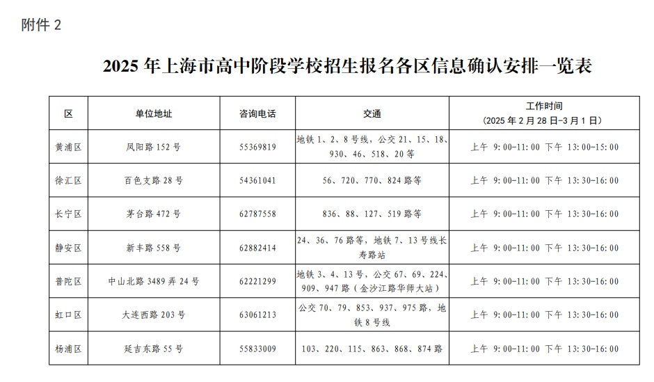 往届生和返沪生完成网上报名后,须于2月28日(星期五)至3月1日(星期六)前往报名所在区的招考机构,现场确认报名信息,确认时须带好报名证明材料(各区确认地点和时间见附件2,证明材料要求见附件3)。