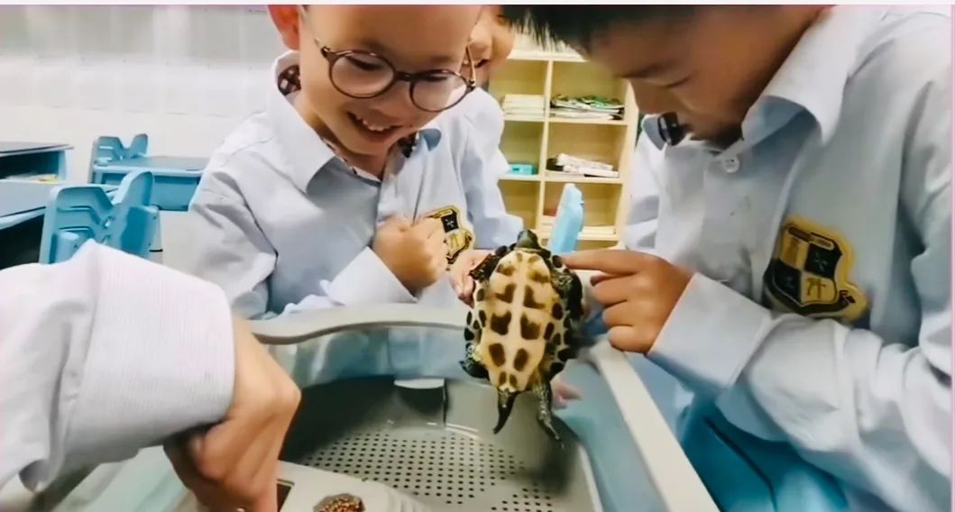 小学部相关负责老师介绍:“有些班级选择了比较小众的宠物,比如六角恐龙等,全班会为各自的班宠取一个好听的名字,并一起研究小动物的生活习性和喂养方式,有的班级还发明了喂食器。假期和周末时间,会有同学轮流带回家照顾,在这过程中,孩子们变得更有耐心了。”