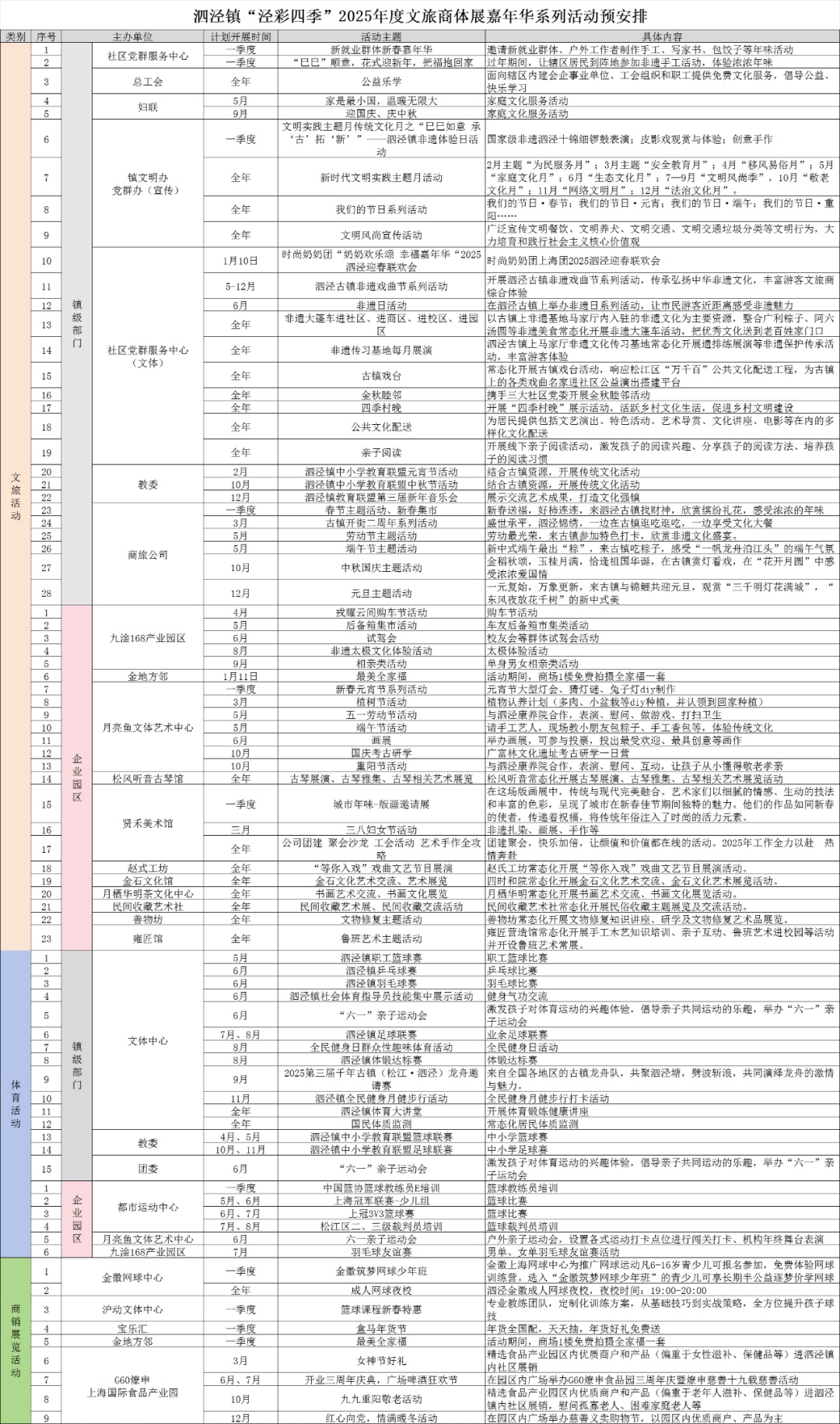 泗泾镇2025年度文旅商体展嘉年华系列活动预安排近日出炉,近百场活动“蓄势待发”,进一步深化“泾彩四季”品牌影响力。