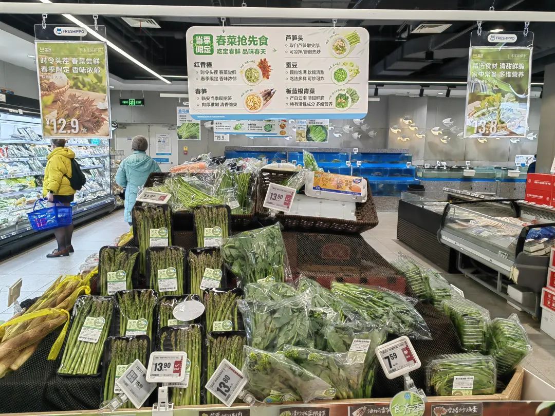 在半淞园社区的一家盒马超市的蔬菜区域,不少市民正在选购菜品。“春菜有一种独特的鲜味,特别是刚刚上市的时候,所以一定要乘早尝鲜。”市民张阿姨告诉记者,前两天发现了一种名叫板蓝根青菜的新品,抱着试一试的心态购买了一份,回家品尝之后感觉味道不错,这次又来回购了。