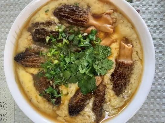 制法:洗净新鲜羊肚菌备用;将鸡蛋打入碗中,加入少许盐调味,打散,加入与鸡蛋液等量的温水,搅拌均匀。将羊肚菌放入蛋液中,包上保鲜膜,扎小孔,蒸10-15分钟。出锅后,撒上葱花或香菜等,淋上少许酱油即可。
