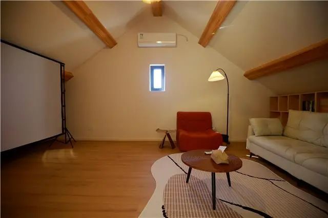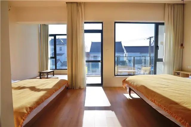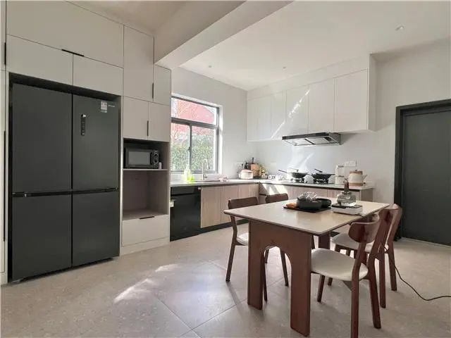 2023年,张连根退休后从市区回到枫泾居住,经过几番思量后,“闲不住”的父亲和“有想法”的女儿一起将老房进行了爆改。“民宿改造的想法以我女儿为主,两代人的眼光不一样,还是要多听听年轻人的想法才能跟上潮流。”张连根说。改造过程中,最大程度保留了农村老宅原有结构并置入现代元素,对内部空间进行重新布局,合理划分出服务、住宿、休闲等多个功能区域。北侧小屋被设计成为了茶室,四楼的一间小屋则化身“秘密影音室”,满足客人多样化需求,还依托绿植和花草,打造了别具特色的“小院景观”。民宿内部,乳白色的墙漆颜色营造出温馨感觉,内设有亲子套房、大床房、露台双床房等10间房,宽大的落地窗、卫浴设备等现代设施一应俱全。