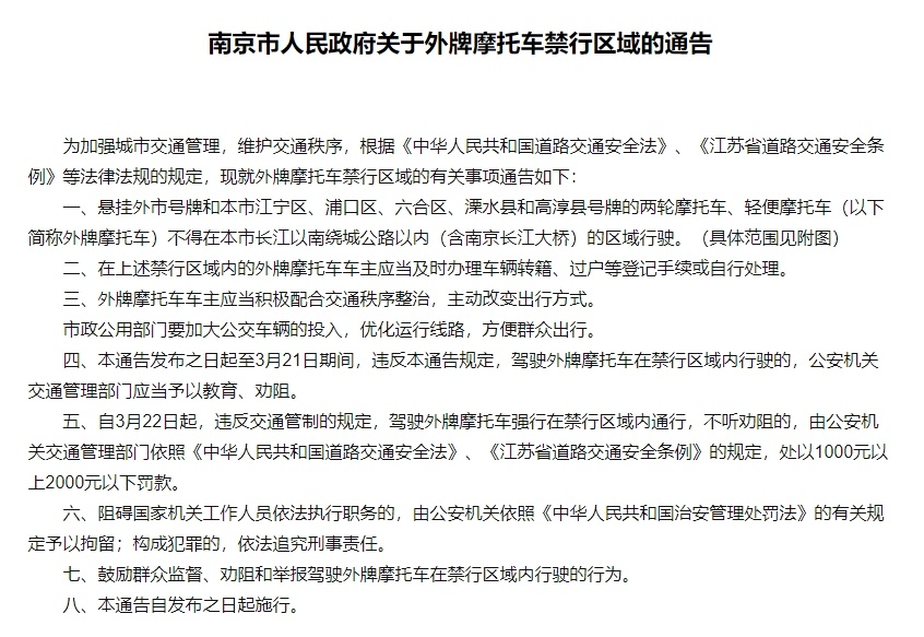 根据南京市人民政府关于外牌摩托车禁行区域的通告,悬挂外市号牌和南京市江宁区、浦口区、六合区、溧水县和高淳县号牌的两轮摩托车、轻便摩托车(以下简称外牌摩托车)不得在南京市长江以南绕城公路以内(含南京长江大桥)的区域行驶。