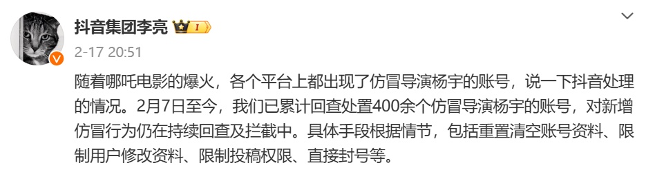 2月17日,抖音集团副总裁李亮在社交平台发文回应该事件。李亮表示:“随着哪吒电影的爆火,各个平台上都出现了仿冒导演杨宇(饺子)的账号,说一下抖音处理的情况。”
