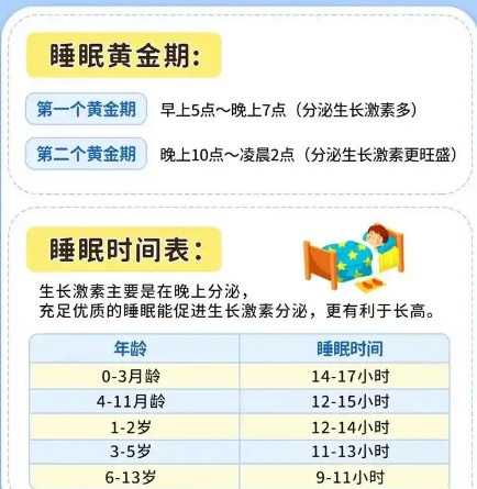 21:00-次日1:00和5:00-7:00是生长激素分泌最多的两个时段,如果在这两个时间段内孩子没有睡着,或者已经醒了,那么就错过了长高的最佳时间段。