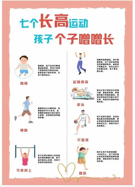 可以选择的运动包括弹跳运动(跳绳、跳高、跳远、跑步等)、延伸运动(单杠引体向上、仰卧起坐、体操等)、全身性运动(篮球、排球、羽毛球、足球和游泳等),强度以能耐受为原则,不可超强度运动。