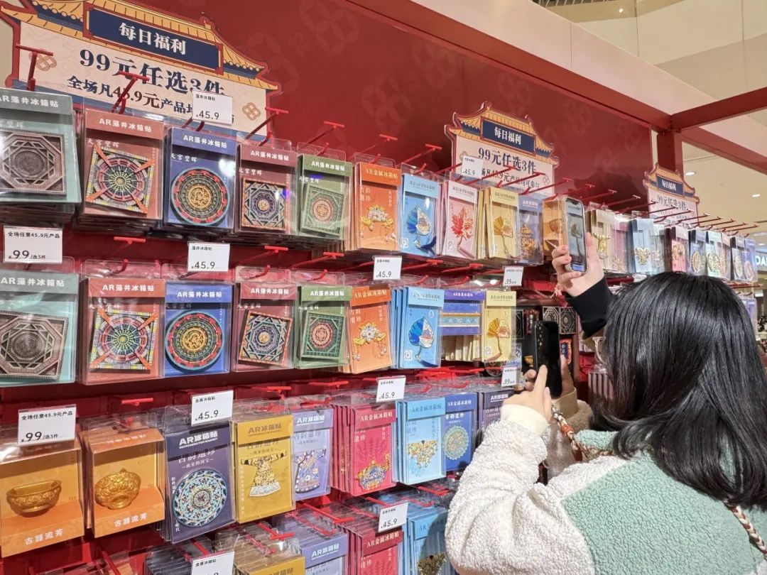 现场上百款故宫文创周边令人眼花缭乱。不仅有款式齐全的故宫文具,几十款图案各异的故宫AR冰箱贴、贺卡小画、挂件,还有经典泡茶杯、家居摆件等伴手礼,每一件都充满了故宫的韵味。