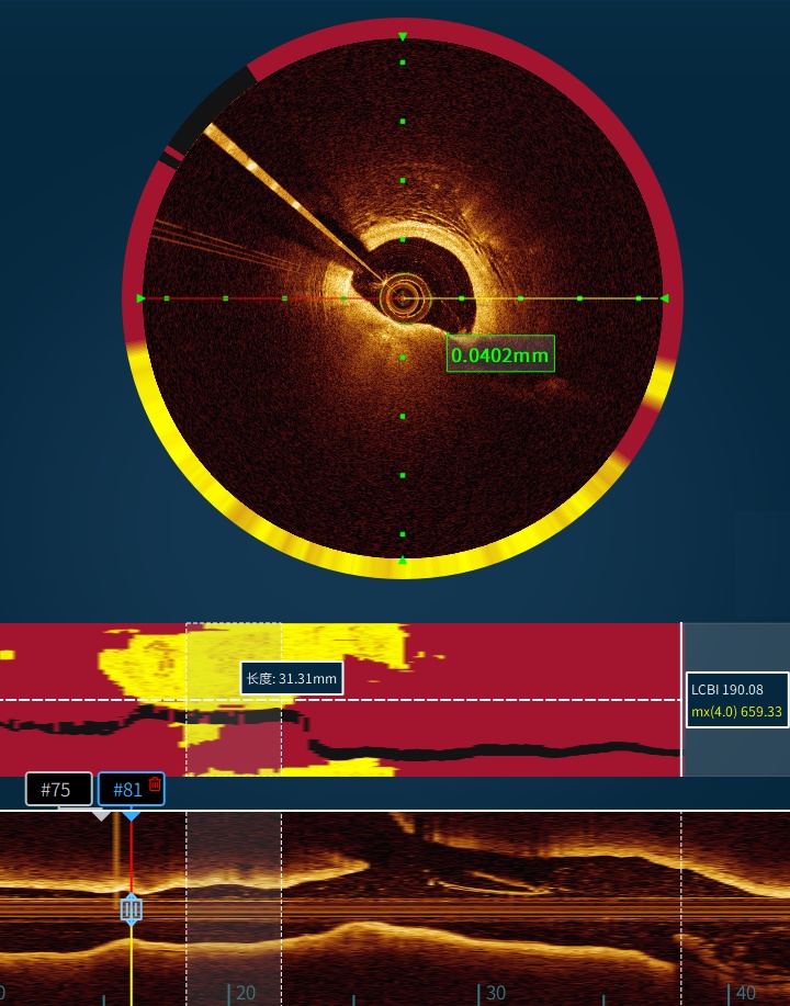 接诊医生为他实施了一种新的融合成像检查,这项检查就像给血管做了个"高清CT+化学分析":光学探头不仅能看清0.01毫米的纤维帽厚度(相当于头发丝的1/10),还能通过近红外光谱"嗅"出斑块里的脂质含量。