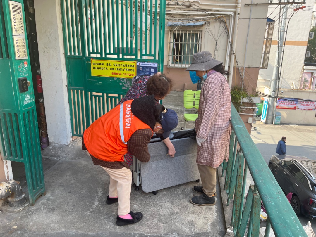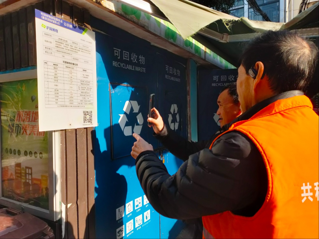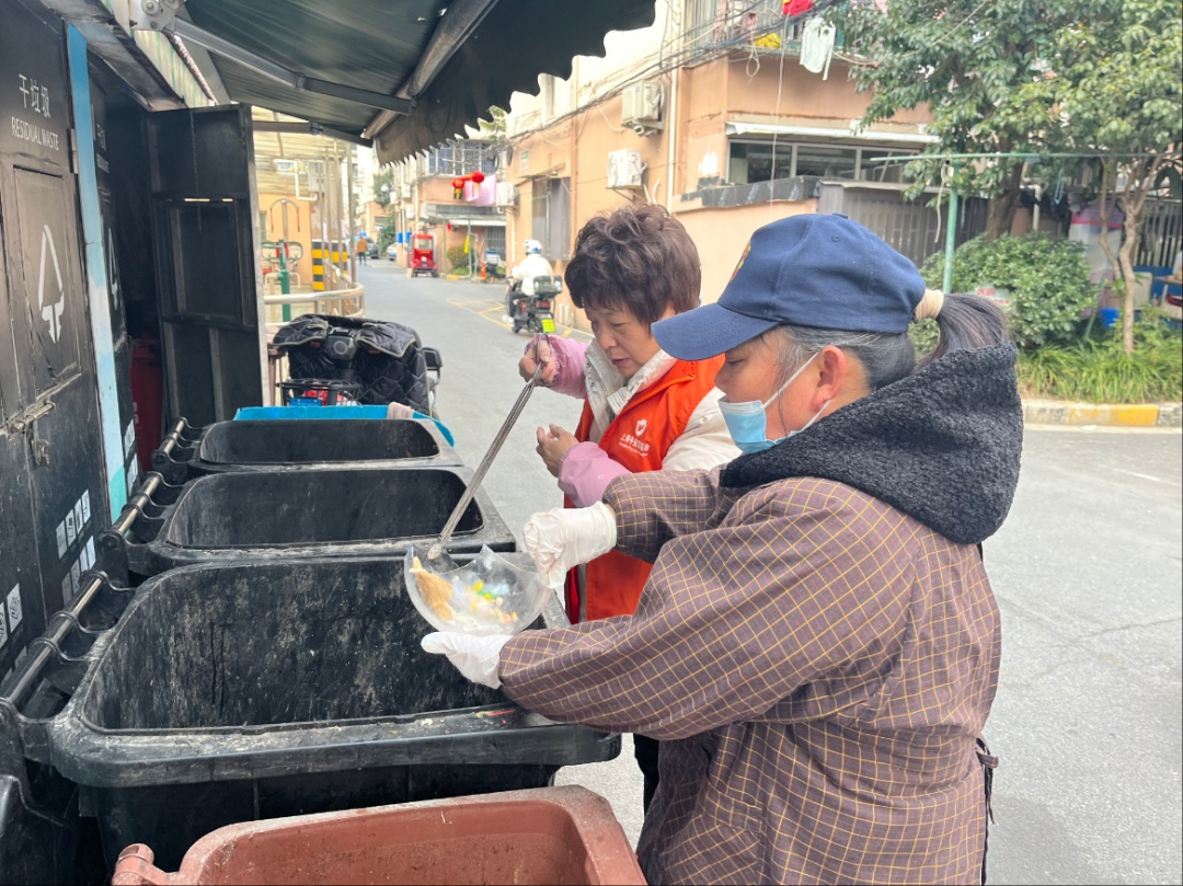 在中山北路805弄居民区,“绿先锋”志愿者们将垃圾分类箱房变成了“分类课堂”,他们“值守”在旁,耐心指导居民正确投放垃圾,并协助“沪尚回收”开展上门回收服务。