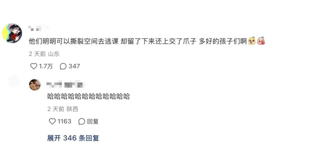 看到这些学生的小创意,有吃瓜网友评论:“他们明明可以撕裂空间去逃课,却留了下来还上交了爪子,多好的孩子们啊!”