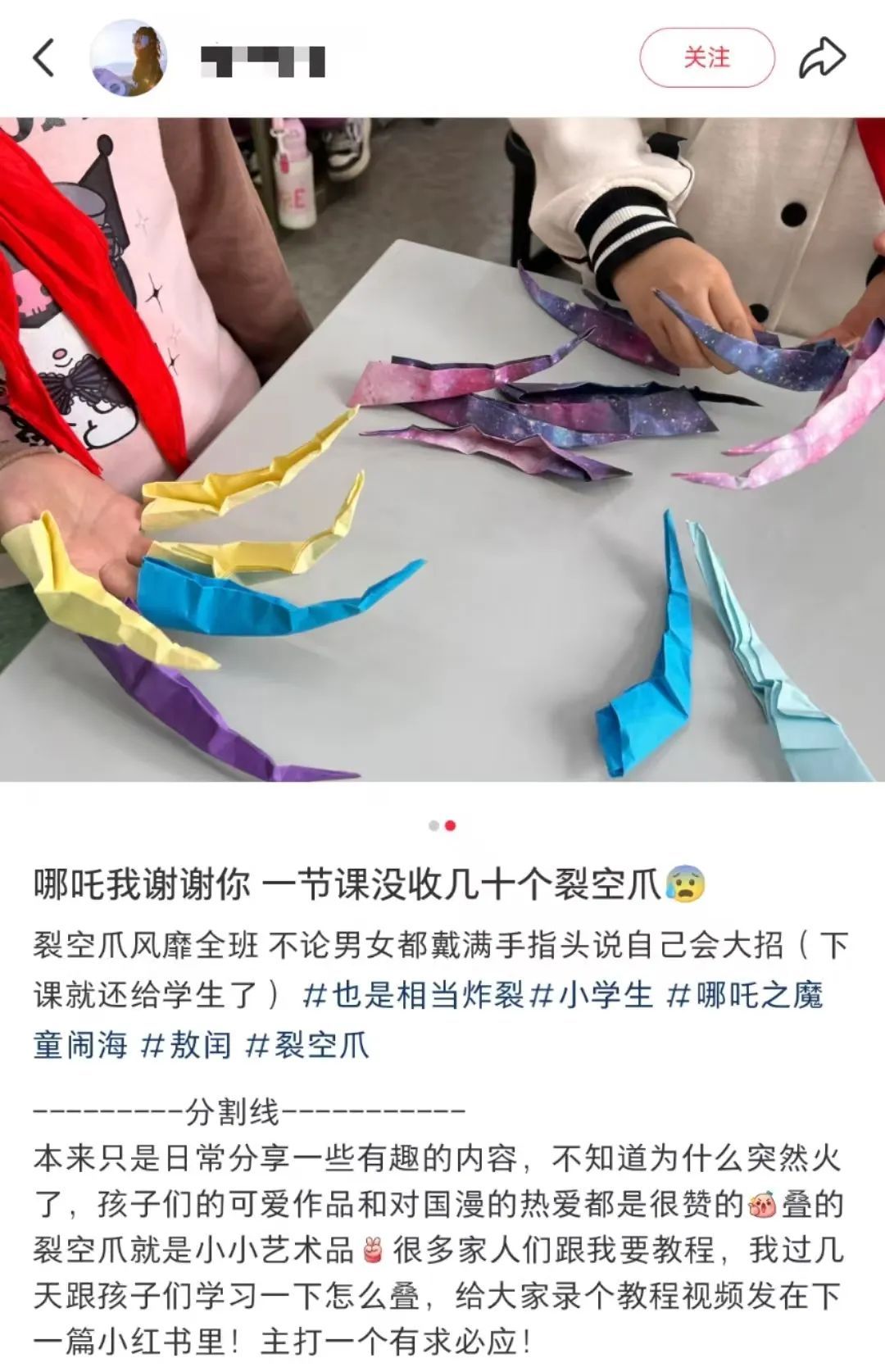 “裂空爪风靡全班,不论男女都戴满手指头说自己会‘大招’。”日前,一位小学老师在社交平台上称,一节课时间没收了孩子们偷偷做的几十个《哪吒2》仿制版“裂空爪”,不过下课后就还给孩子们了。
