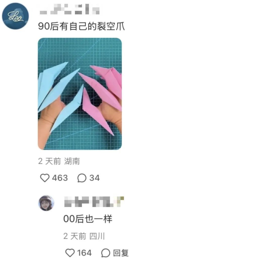 其实,类似“裂空爪”这样能套在手指上的折纸玩具早已有之,不少90后也想起了曾经在学校里的“大制作”——将十个纸爪子拼接在一起,形成一个炫酷的圆环。