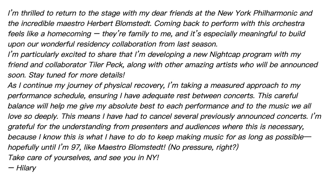 希拉里·哈恩因患“双重神经压迫症(Double pinched nerve)”接受治疗并休息七个月后,于2月20日宣布将于下周三(