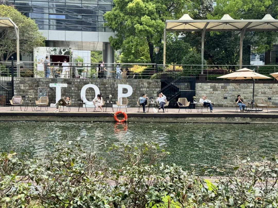 漫步园区,工作与生活并行不悖,勃勃生机喷涌而出。临近午餐时间,位于江场三路上的白领食堂里熙熙攘攘,本帮小菜、苏式面条、港式烧腊、川渝小吃可为6万名白领员工提供多元化的餐饮选择;饭后,彭越浦两旁的健身步道如同蓝色飘带串联起园区各个地块,成为又一个散步、放松的好去处;