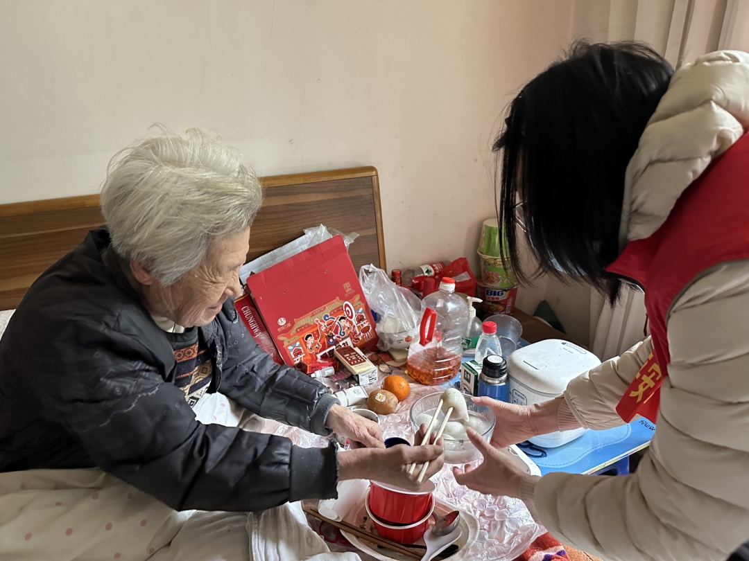 “今年春节,想到关奶奶一个人在家里,我们也想把节日欢乐喜庆氛围带进老人家中。”亭新党支部工作人员下厨为关奶奶送去了一桌“年夜饭”:有鱼有肉、有东北特色水饺、有上海特色小菜,南北美食融合,非常丰盛。志愿者们还帮忙打扫房间,贴上新春春联,热热闹闹,让奶奶在家里感受到新年气氛,感受到社区“家人”带来的温暖。