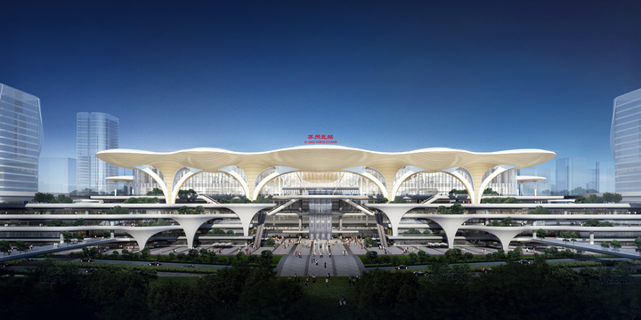 南侧光谷客厅设计效果图 作为既有京沪高铁、在建通甬高铁、规划中的如通苏湖城际铁路(江苏段)的共建车站,改扩建后的苏州北站将形成10台24线站场规模,并预留2台4线发展空间。其中,京沪高铁场2台6线,通甬高铁场4台10线,城际场4台8线。
