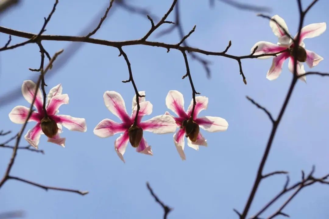 2021年起,上海植物园就与宝华山国家森林公园管委会等方面携手合作,开展宝华玉兰的迁地保护工作,收集种子并进行播种,成果喜人,而在园区的木兰园,你也可以看到栽种的宝华玉兰,白色的花被片上带着淡紫红色的底色,如羞红的脸颊。它们的花期是2月下旬至3月上旬,花期短暂,趁此机会一起去看看这种珍稀植物吧。