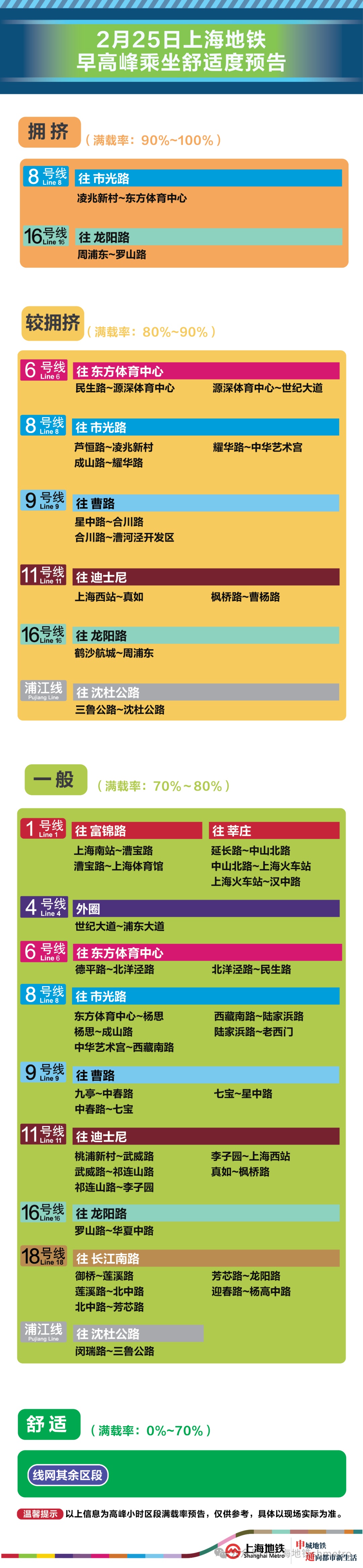 为提升上海地铁早高峰期间出行服务水平,提升乘客乘坐体验,上海地铁向乘客提供乘坐舒适度预告,方便乘客提