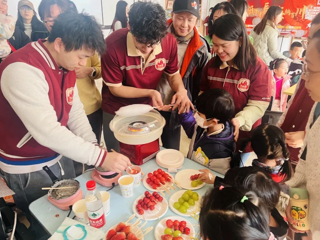 光看光学还不够,在教师和志愿者的引导下,亲子家庭一同动手,制作冰糖葫芦、棉花糖等中国特色小吃。大家将一串串葡萄、山楂、草莓等水果插进装有糖浆的杯中,裹上一层热乎乎的糖衣,甜香四溢,再将棉花糖的竹签放在棉花糖机器上慢慢旋转……不一会儿,孩子们最爱的甜食小吃就完成了,大家乐开了花。