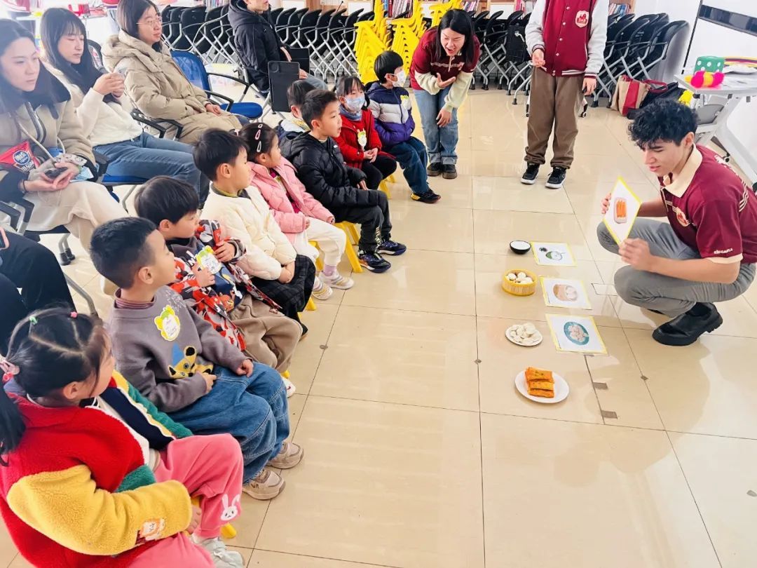 活动伊始,只见画着小笼包、汤圆、春卷、饺子等的卡通图片被摆放在地,孩子们一边猜它们的英文名字,一边回忆起了自己在家吃美食、过传统佳节的画面。外籍教师以你问我答、看图说话等形式,带孩子们进一步认识了传统美食,场景一派和乐融融。