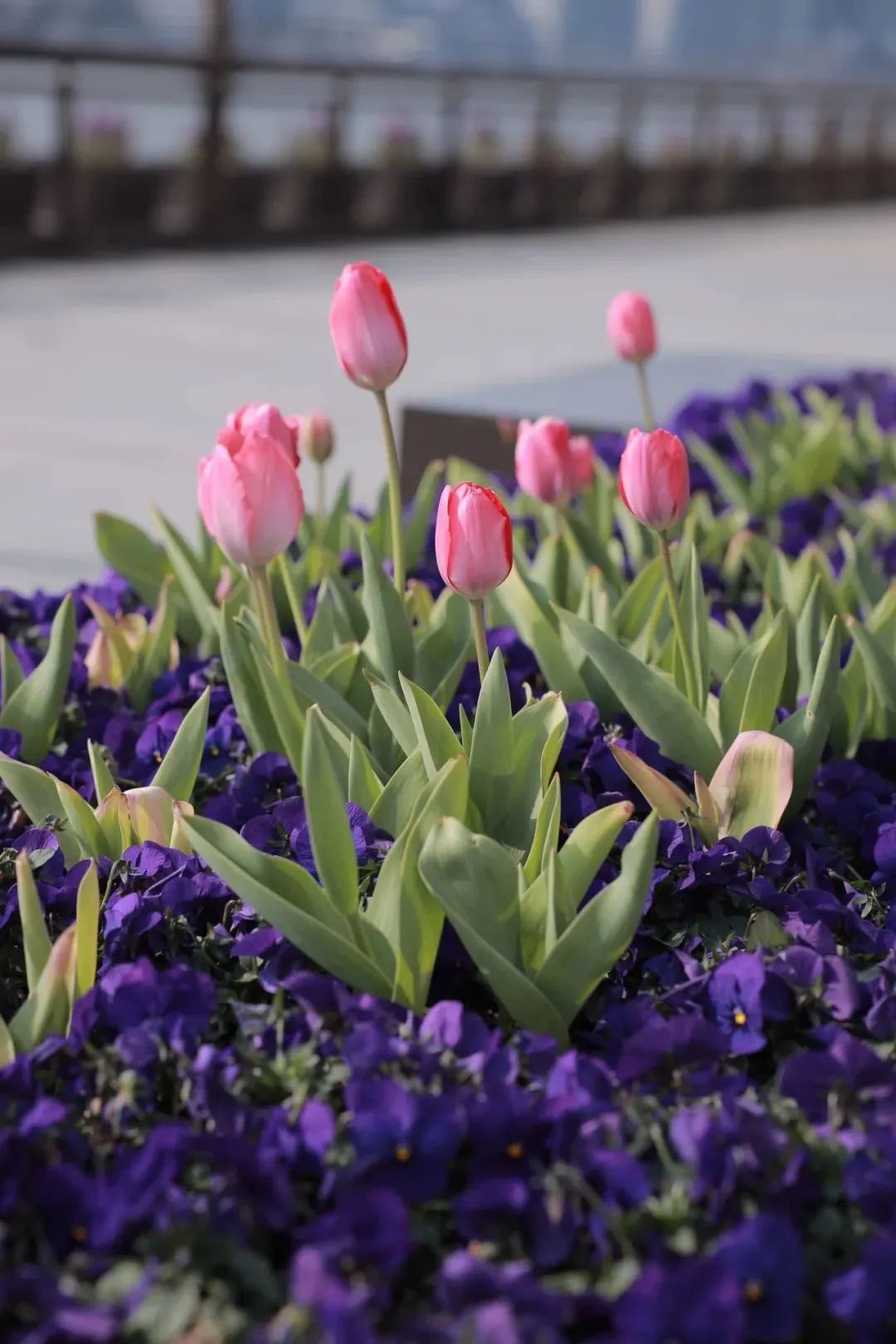 此外,也可利用滨江沿岸的工业风遗存元素构图,将浦江两岸的风景与郁金香一同框入镜头,拍出多层次效果。