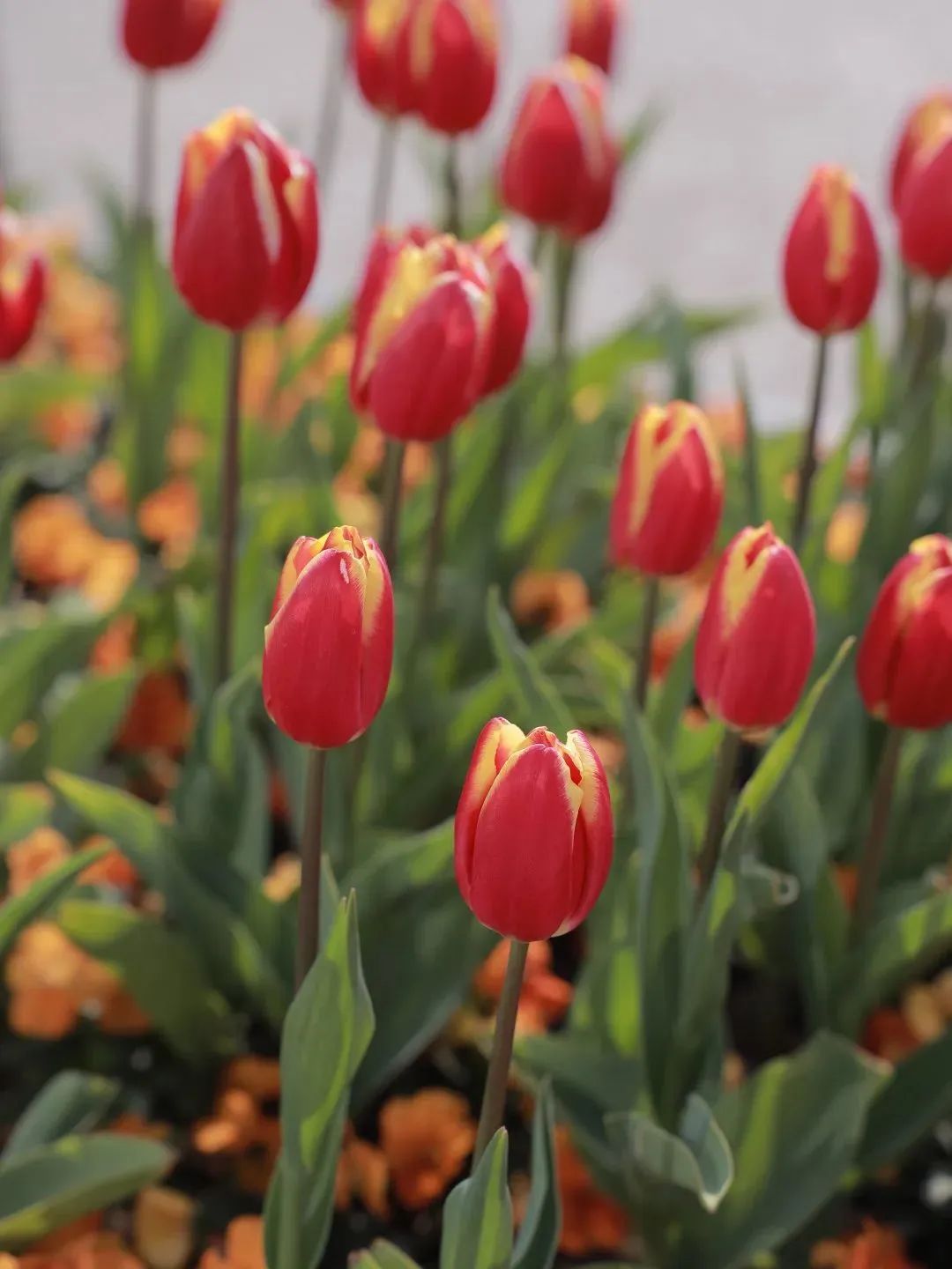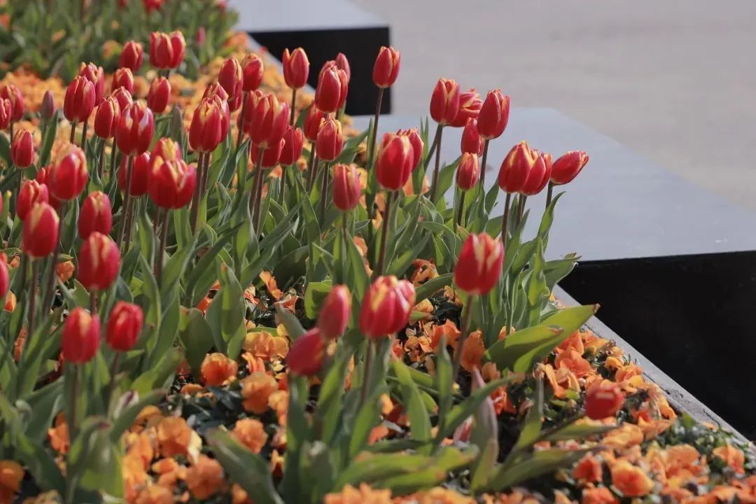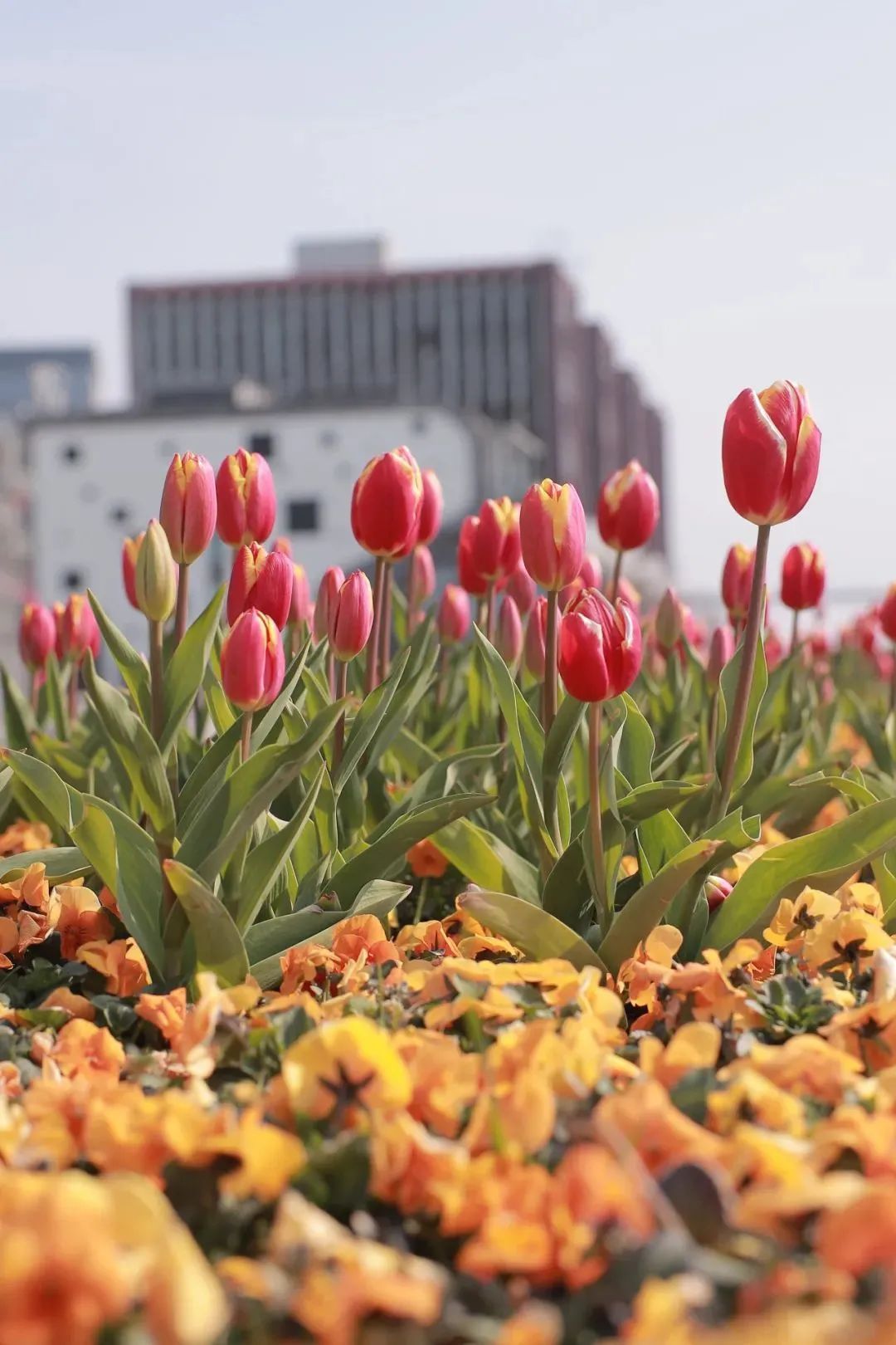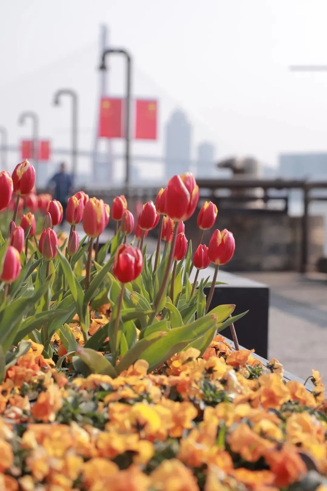 在杨浦滨江东方渔人码头,一朵朵如酒杯般精致的郁金香错落有致地盛开着,红色的花瓣镶着“金边”,带着早春的限定色彩,在小花坛里展露着春色。在这里,古老的工业遗迹与现代的都市风光交相辉映,郁金香花海如同一条绚烂的纽带,将历史与现代、自然与城市完美融合。