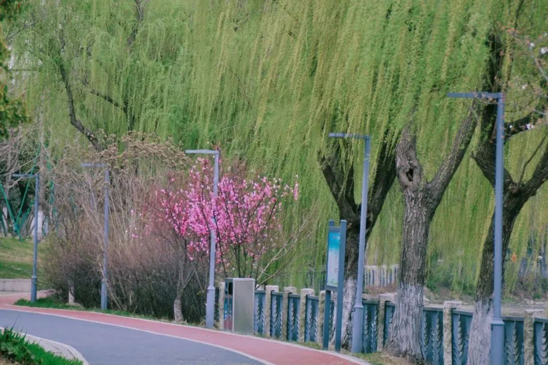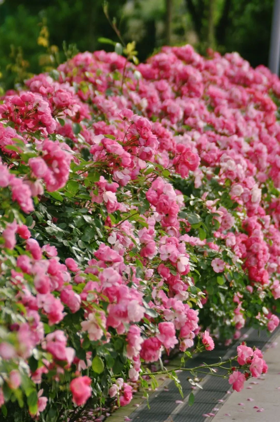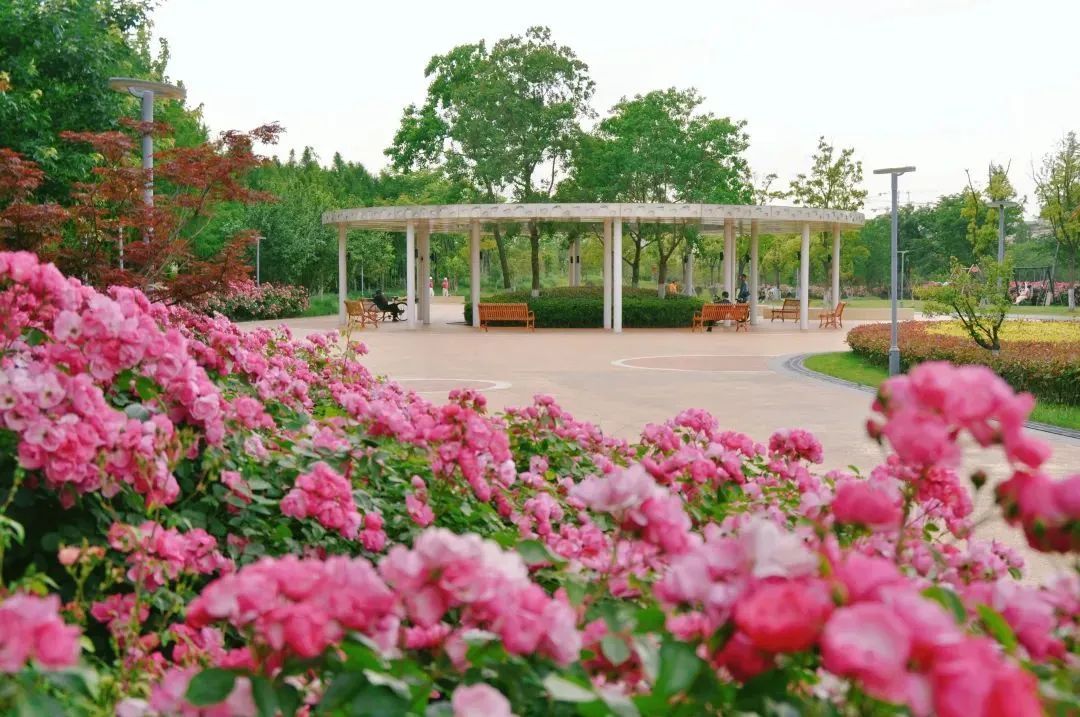 上善广场附近,绵延百米的蔷薇花墙,必打卡!那一簇簇玫红色的花朵,散发着宜人的香气,微风拂过,花瓣轻盈摇曳,仿佛在倾诉着春天的甜美与柔和。这里,无疑是情侣们浪漫约会的理想之地。