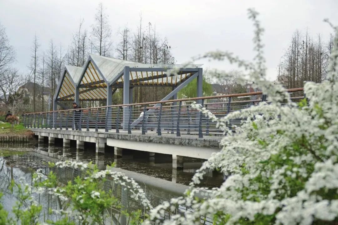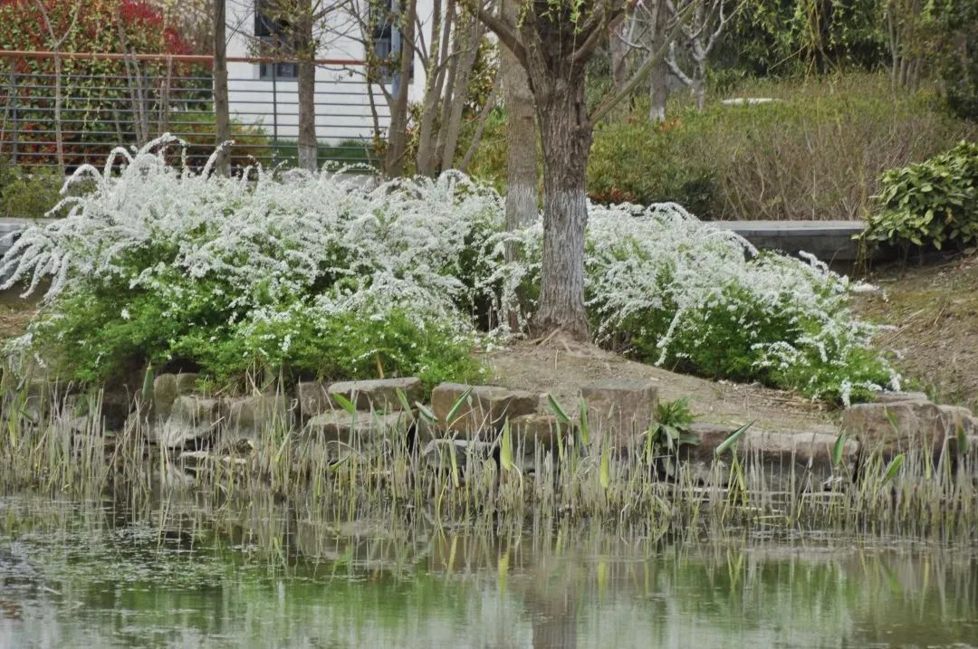 在胡渡浜人行桥、上善桥周边以及晨兴公园等处,都能看到雪柳的身影。它们带着中国韵味,如雪似柳,花朵清雅雪白,姿态高挑,花开繁密,非常值得一赏。