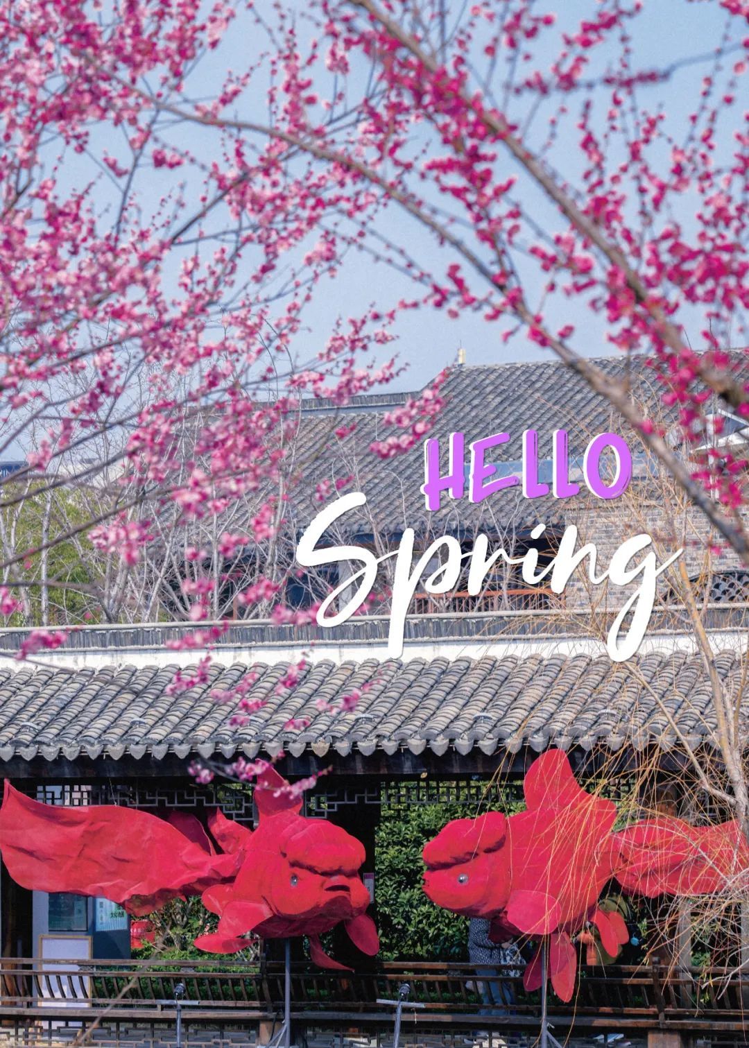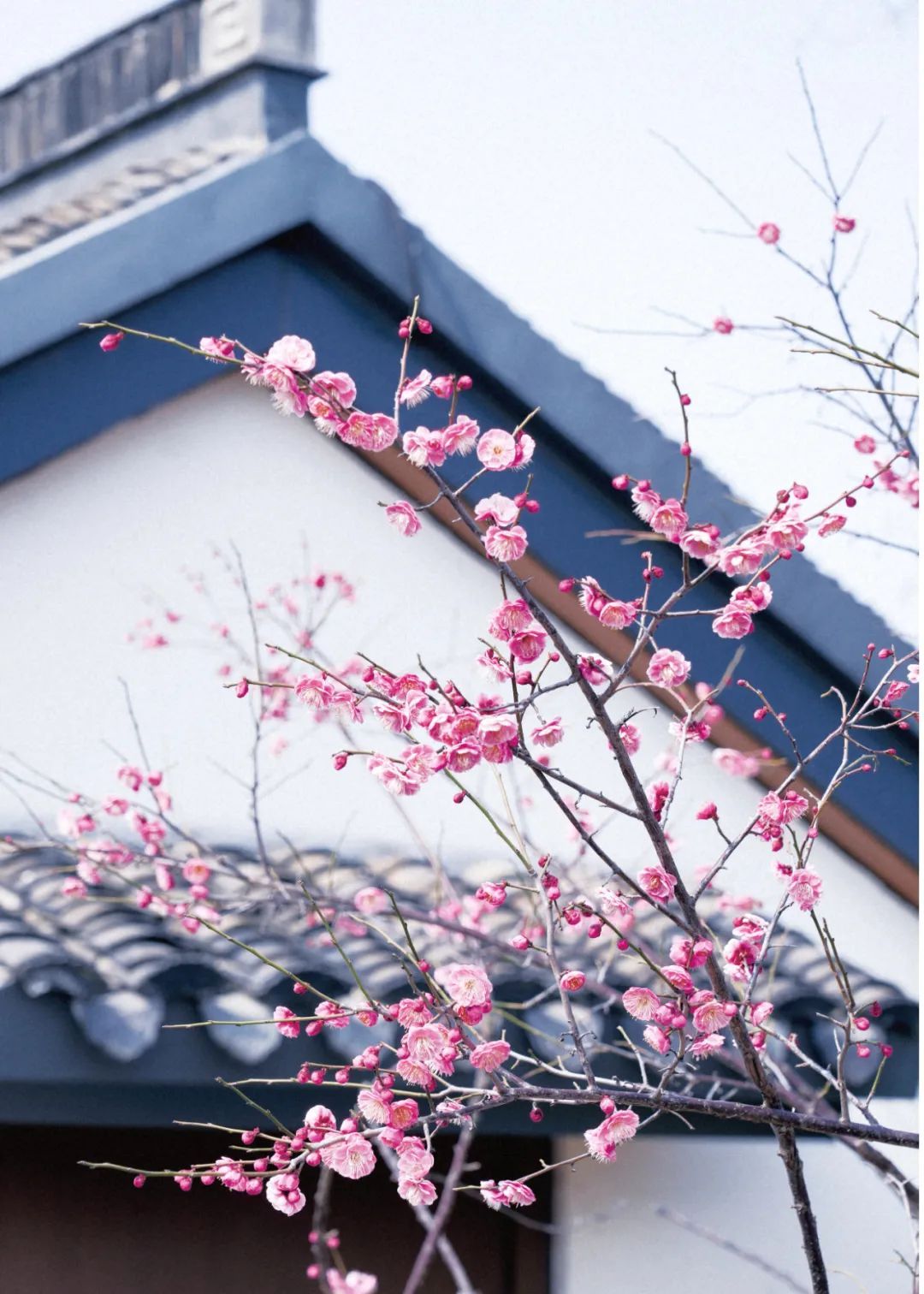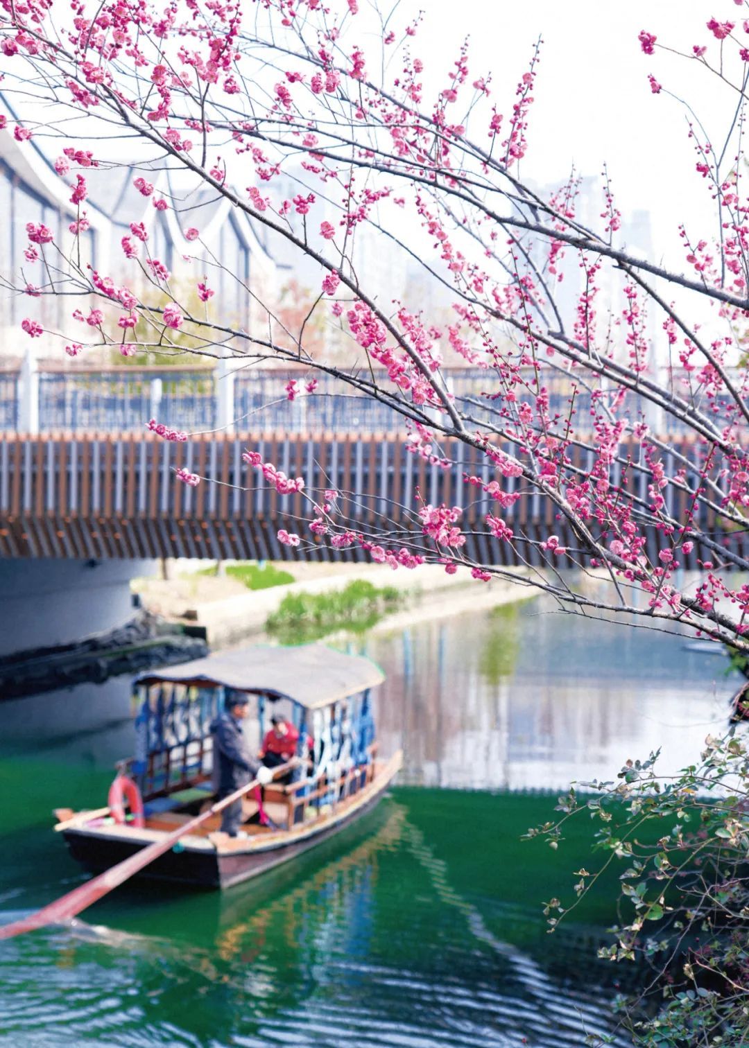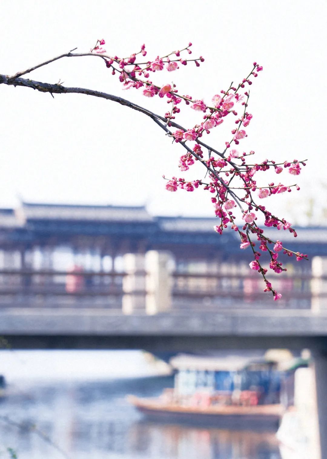 小桥流水潺潺,桥洞下摇橹客船缓缓驶过,飞檐翘角间红梅竞放,虚实相间,光影交错,化作江南春天里最动人的风景。