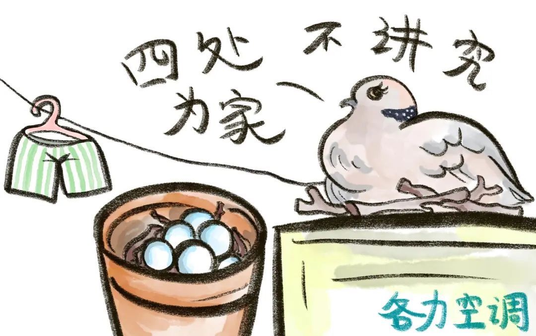 不同于其他鸟巢制作精巧,珠颈斑鸠随便摆几根树枝就能养育下一代。它能在你家的空调外机上,甚至是小花盆里和晒在外面的衣服上随地下蛋。虽然简陋却也是它们生存的大智慧,背靠人造物好乘凉。