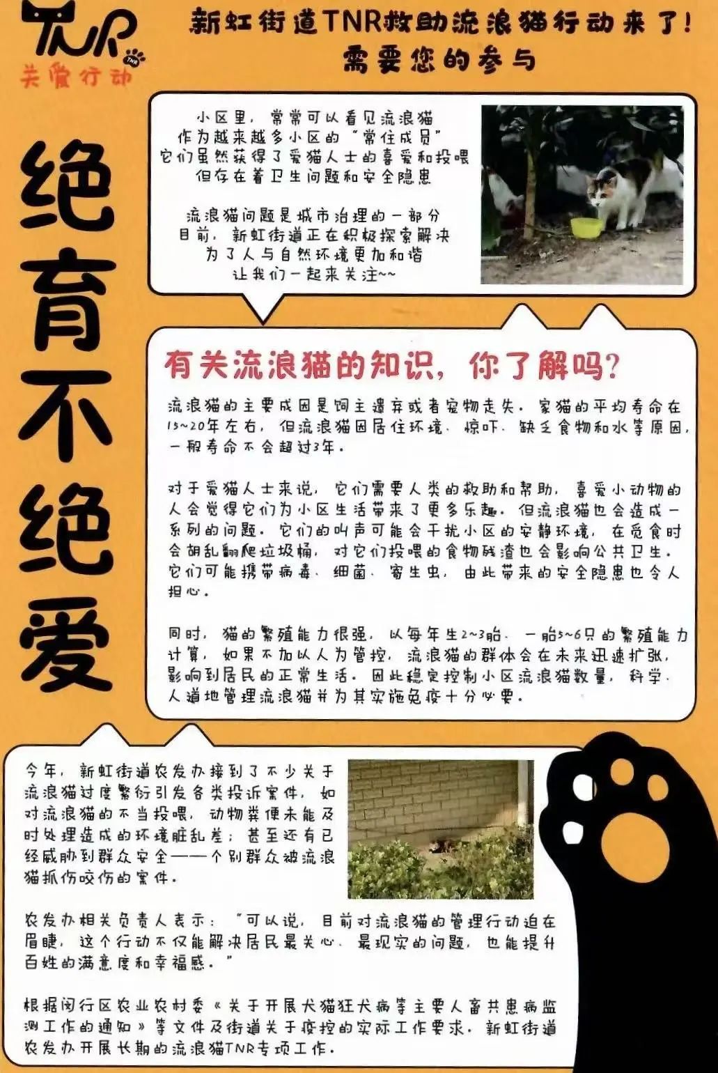 2020年起,社区里的爱猫人士自发组建50余人的志愿者群,将无序投喂升级为规范治理,通过“线上共议+线下共治”形成“社区科学喂养公约”。面对初期高达百余只的流浪猫群,志愿者们创新引入国际通行的TNR(抓捕—绝育—放归)模式,自筹资金实施精准绝育,累计完成40余例手术,成功将流浪猫总量控制在动态平衡区间。