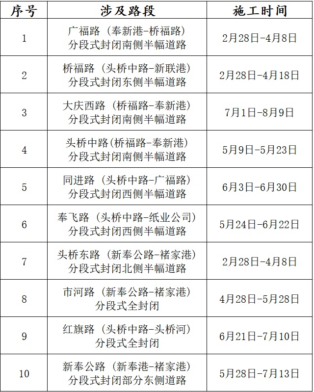 告 示根据奉贤区头桥地区集建区排水管网设施更新改造工程建设需要,现需对头桥街道集建区部分道路进行施工,为确保施工期间的交通安全,现通告如下:一、施工时间:2025年2月28日~2025年9月30日二、施工道路:施工期间,施工单位将按照要求设置封闭围挡和警示标志、安装爆闪灯等警示标志,安排专人加强交通疏导,尽量保持道路通行,由此给居民以及司乘人员出行带来的不便,请谅解。如遇特殊原因到期未完工,将按照实际需要顺延工期。头桥街道城市建设管理事务中心2025年2月25日