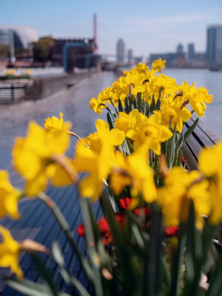 一路漫步到杨浦自来水厂附近,不经意间,便会被那一抹明亮的黄色所吸引。黄色水仙花宛如灵动的精灵,悄然绽放,为这片滨江地带增添了独特的魅力。