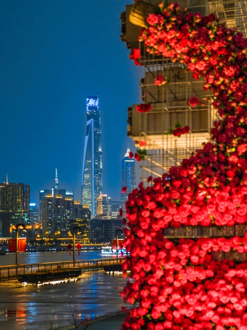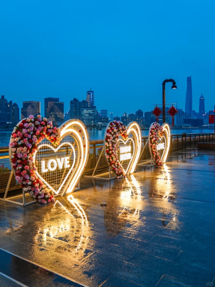 江边亮起灯光的爱心装置上,艳粉色、淡粉色、浅白色的蔷薇花围绕,将杨浦滨江工业风的厚重与自然的柔美完美融合,成为了城市中一道独特的风景线。