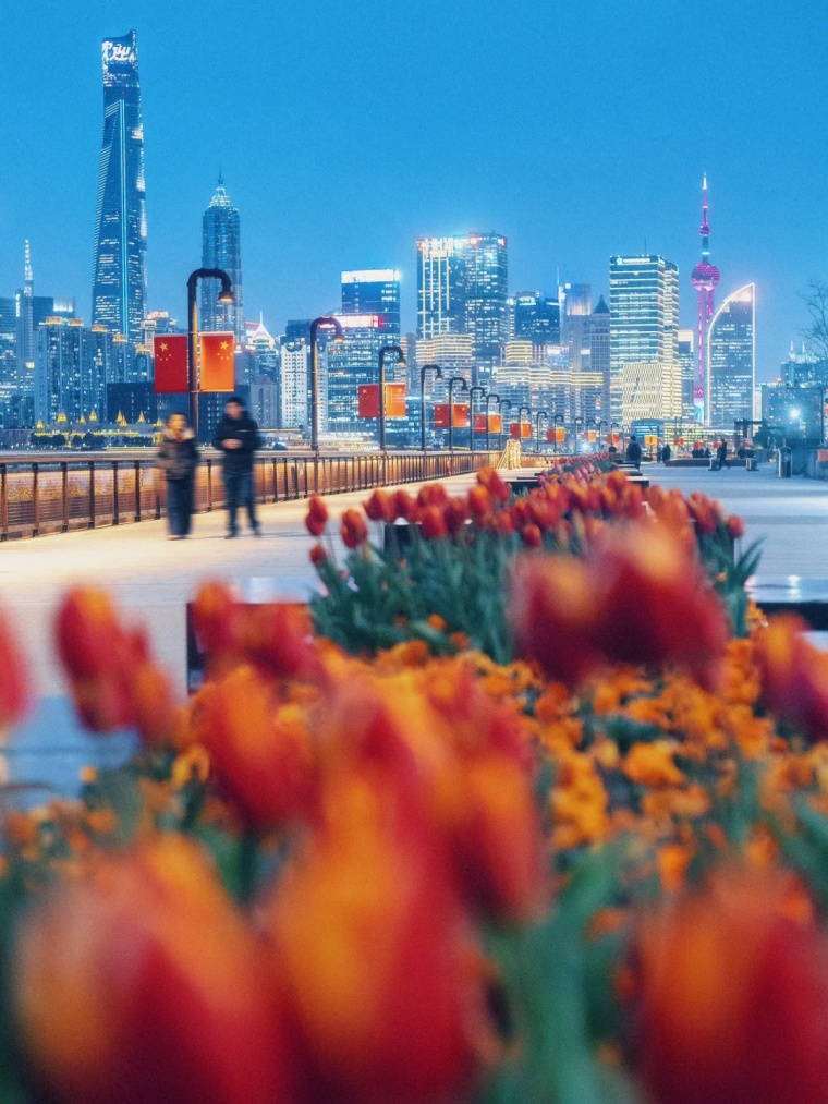 当夜幕降临,杨浦滨江仿佛被施了魔法一般,呈现出一种别样的浪漫氛围。那盛开的花朵更是在夜色中散发着迷人的魅力,成为了滨江畔最璀璨的存在。