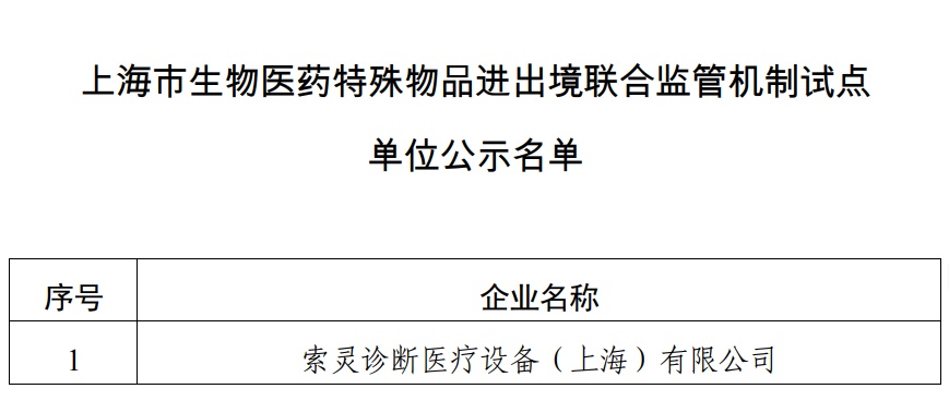 近日,宝山高新区企业索灵诊断医疗设备(上海)有限公司获市科委批准为上海市生物医药特殊物品进出境联合监管机制(以下简称“联合监管机制”)试点单位(详见文末“阅读原文”),成为宝山首家获批联合监管机制的生物医药企业。