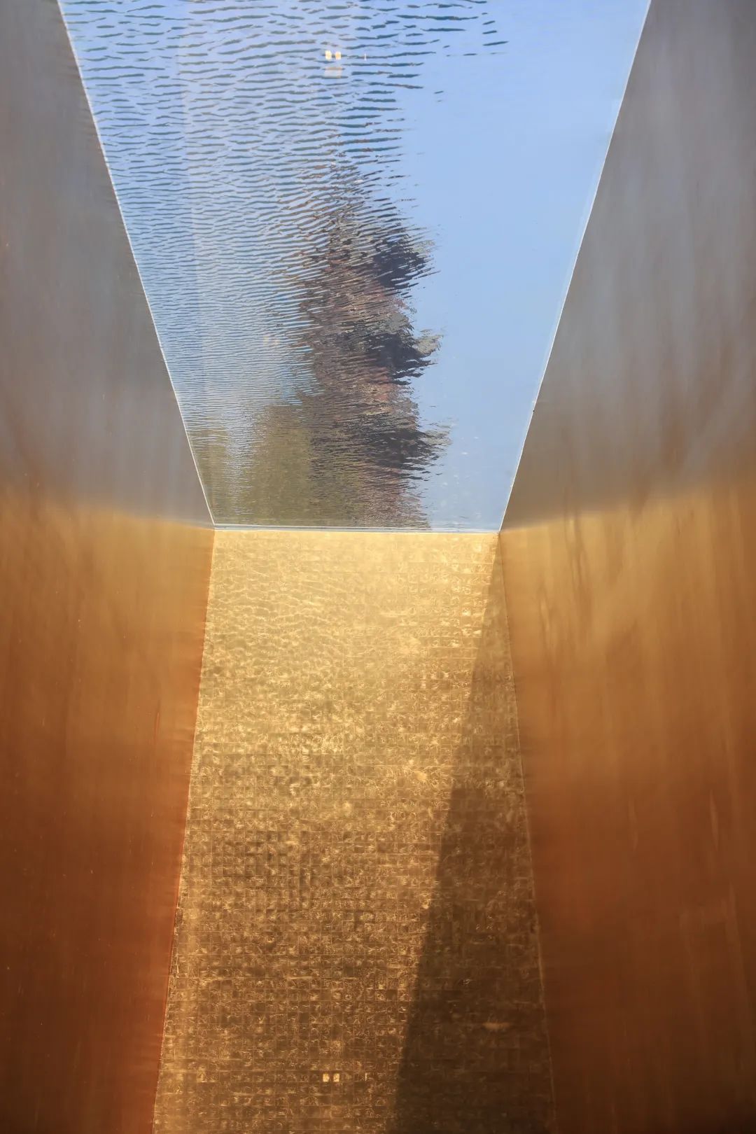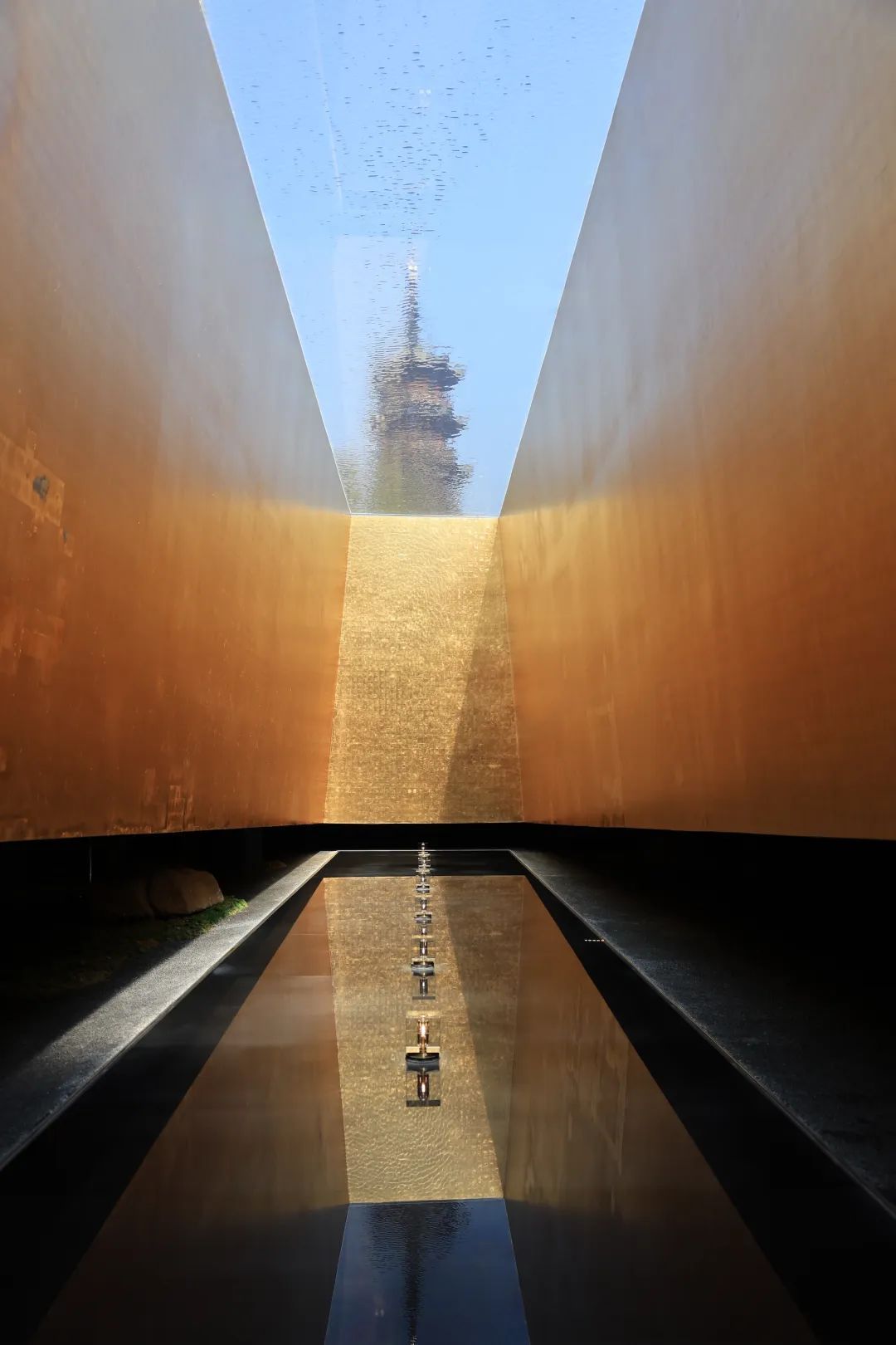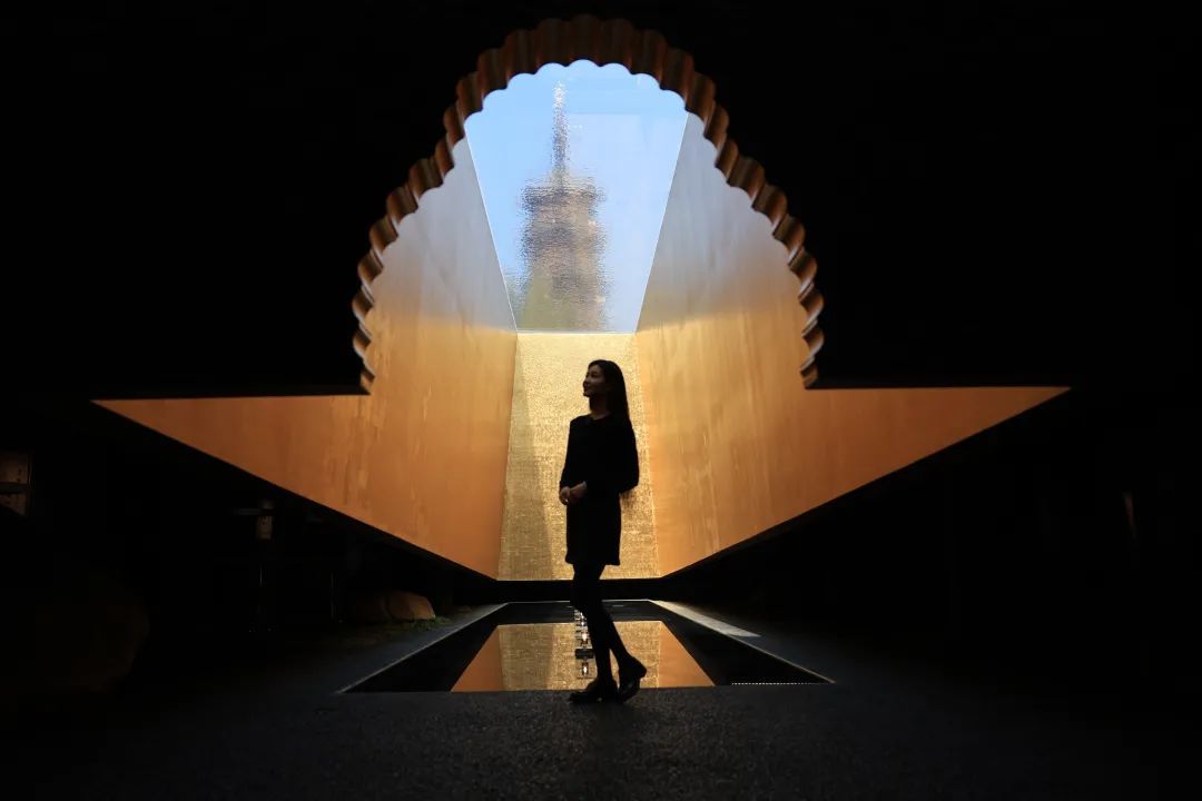 塔影区域是最核心的区域,位于龙华广场水池的正下方,沿着水池壁向下延展出三面金色的墙体,透过水池底部可以看到龙华塔。没风的时候,水池就像一面玻璃,大家可以清晰地看到龙华塔,阳光洒在金色的墙上,金碧辉煌;微风拂过时,水面泛起层层涟漪,水波被阳光映照,影子洒在墙面上,仿若瀑布流淌。在此欣赏风景,内心可以瞬间平静下来。