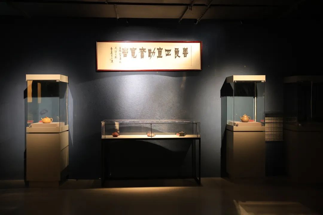 在塔影区域的四周是一个展厅,目前正在举办《共君聚砂·王强抟泥茶叙》紫砂壶展,这些充满禅意的作品,值得静心欣赏。