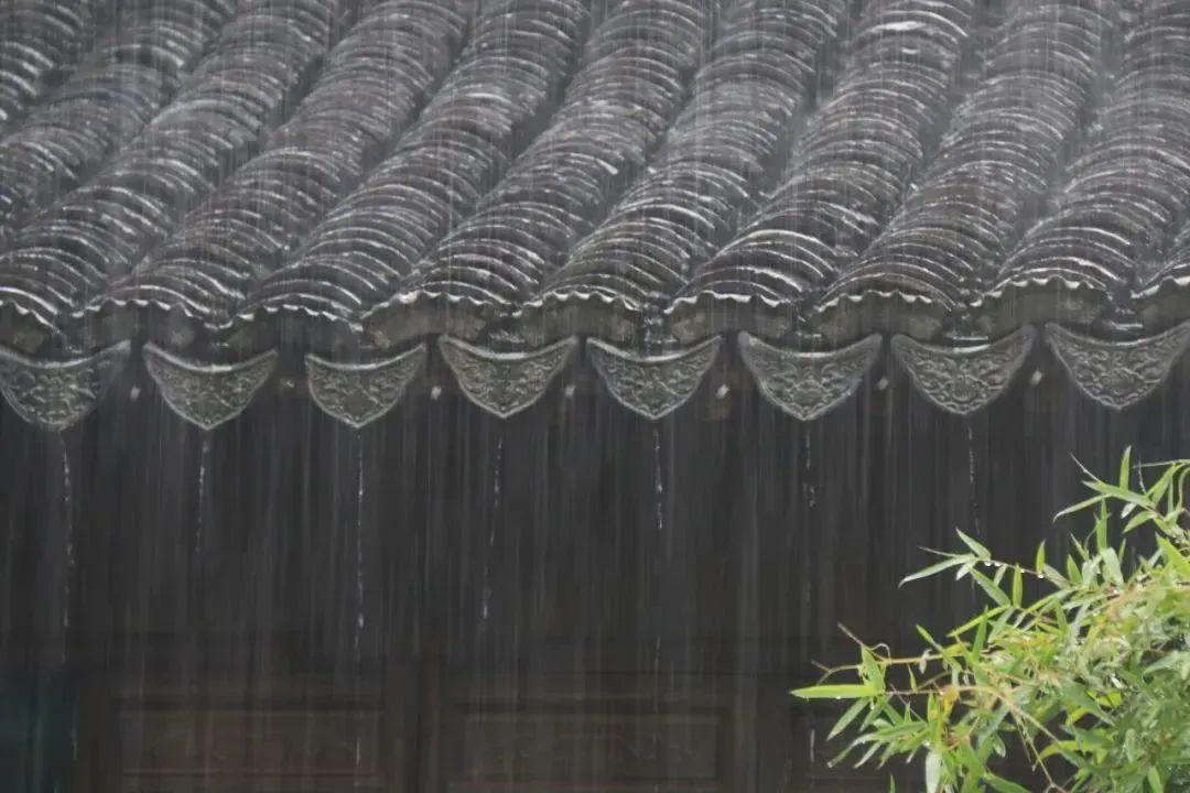 绵绵细雨下的枫泾古镇,雨水淋湿了白墙黑瓦,屋檐下水连成串,石板路湿滑泛着光,河水倒映着古老的拱桥,老屋承载着历史的积淀……