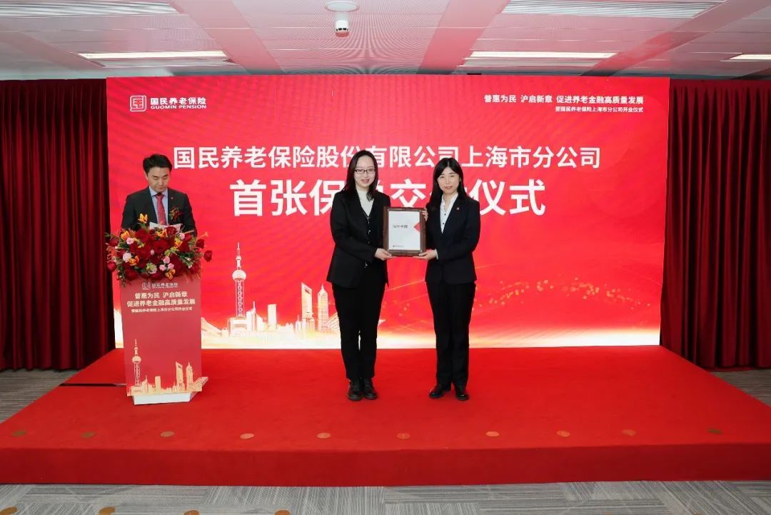 在参会各方的见证下,国民养老保险上海市分公司完成首张保单的成功交付。