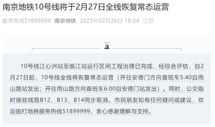 交汇点讯 2月26日南京地铁发布消息,自2月27日起,10号线全线将恢复常态运营(开往安德门方向首班车5:40自雨山路站发出;开往雨山路方向首班车6:00自安德门站发出)。同时,公交临时接驳线路B12、B13、B14同步取消。此前,南京地铁发布通报称10号线预计3月1日全线恢复常态运营。