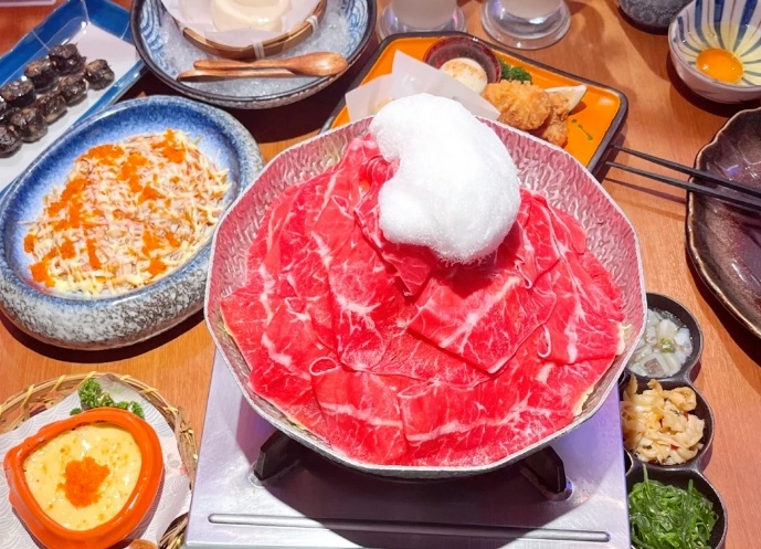 2019年,小锄匠在上海开出首店,凭借一道“富士山寿喜烧”迅速出圈。所谓“富士山寿喜烧”,即将牛肉堆砌成小山形状,顶部放上蓬松柔软的棉花糖,就像富士山顶的积雪,光靠颜值就圈粉不少。