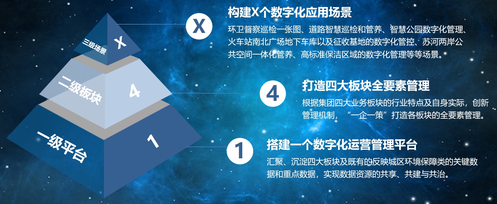 集团数字化运营管理平台:一级平台、二级环卫板块、二级市政板块、二级绿化板块、二级物业板块