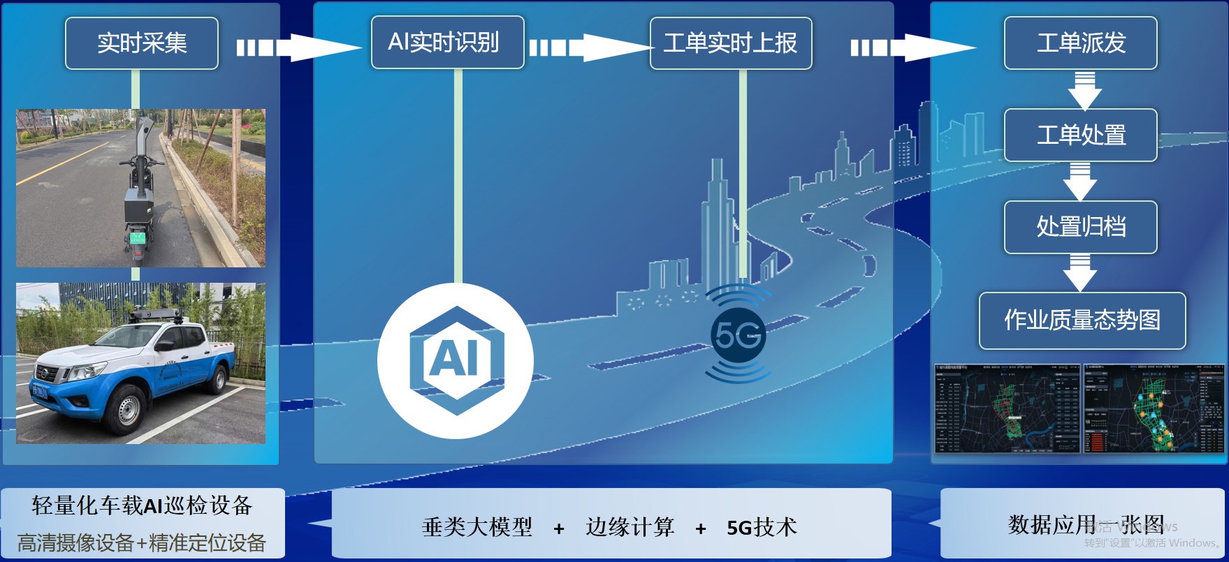 在城市运营AI一体化巡检中,随着巡检车的行驶,道路仿佛在进行一场严格的“体检”。5G巡检车配置的AI智能设备能够快速、精准采集道路环境卫生及病害数据,智能分析形成事件,根据业务分发规则推送至环卫和市政板块业务中台。