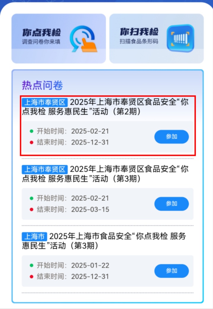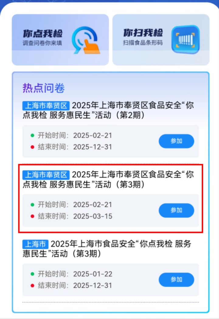 2.在“热点问卷”中选择“2025年上海市奉贤区食品安全“你点我检 服务惠民生”活动(第3期)”点击“参加”,即可参与本次问卷调查。