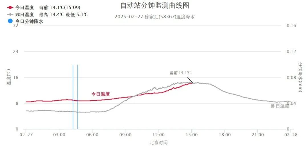 今日阴天小雨开场,午后天空状况略有好转,阳光露面,气温缓步上升,徐家汇站最高气温升至14.7度。风力较小,大气扩散条件不理想,白天有轻度霾。