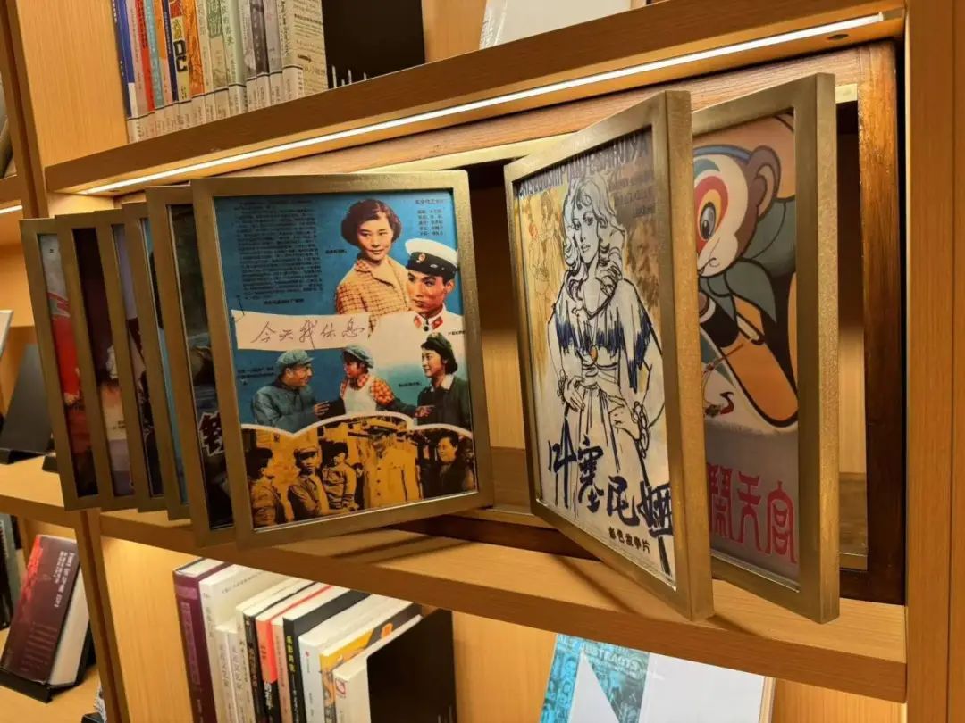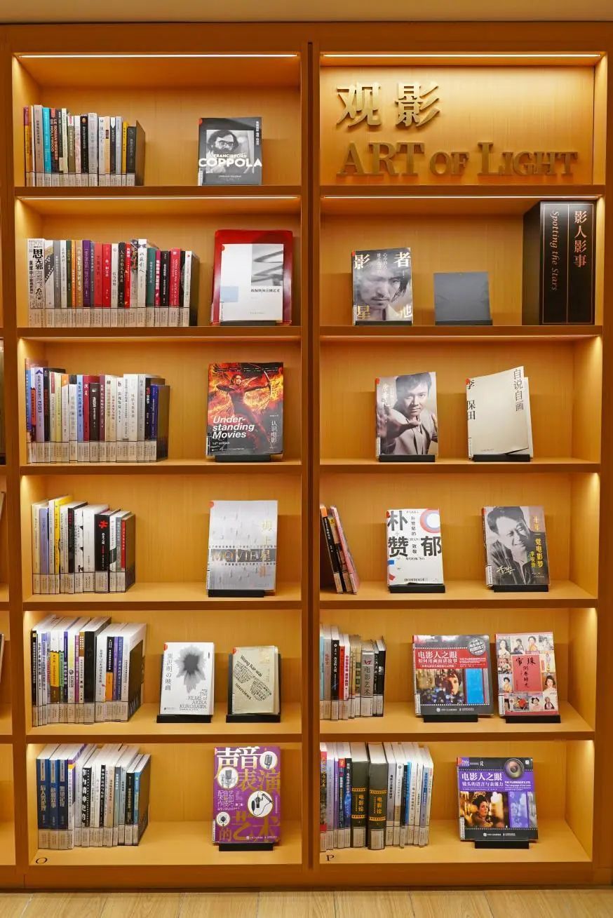 徐家汇书院中庭两侧有八个“光盒空间”,其中二楼东侧夹层的“艺韵”主题空间里展示了音乐和电影等主题的书籍,有老电影播映,也有很多电影音乐的唱片,配有复古唱片机和墨绿色靠垫的皮质沙发,营造了舒缓放松的阅读氛围,有空来坐坐吧。