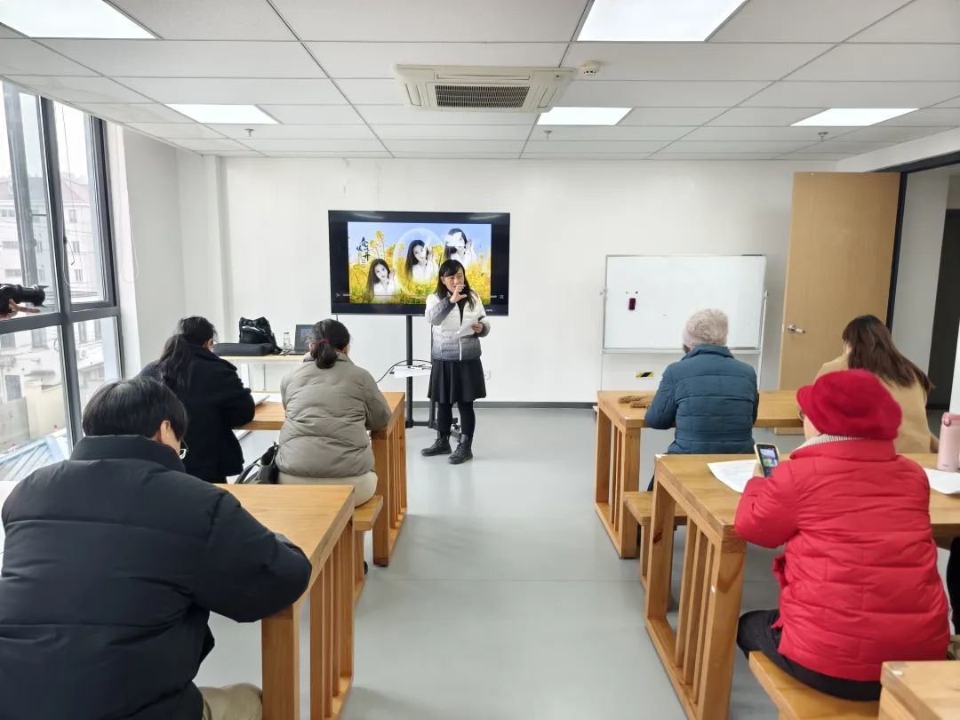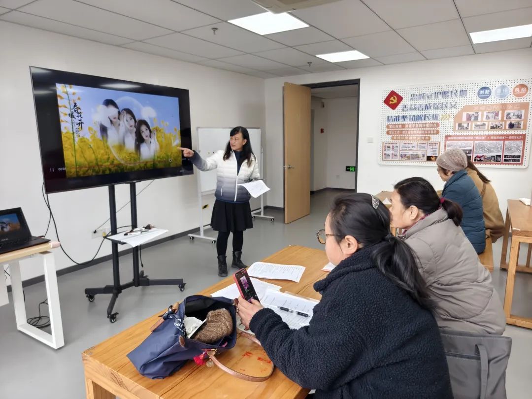 在吴淞街道党群服务中心的一间教室里,20多名学员全神贯注,听着辅导老师讲解“剪映”APP的入门知识,老师还结合“春暖花开”电子相册制作案例,让大家一个步骤一个步骤地熟悉“剪映”APP的使用。